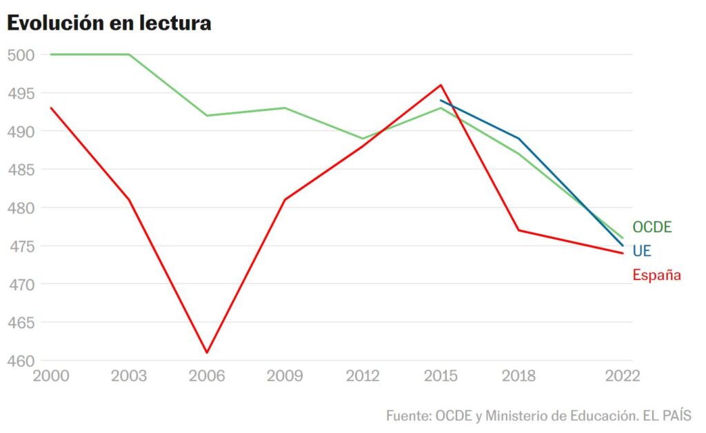 – Los españoles han retrocedido tres puntos en comprensión lectora hasta los 474, quedando por debajo de las medias de la OCDE y de la UE.