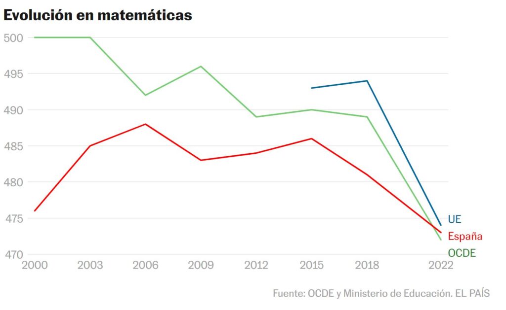 Además, si partimos de la hipótesis de que todo gasto en educación debería considerarse como inversión, el Informe PISA 2022 destaca que no siempre el nivel de gasto en educación está relacionado con el rendimiento de los alumnos, siendo más importante la eficiencia en el gasto público que el volumen del mismo.La realidad es que, desde 2015, España ha caído 15 puntos en Matemáticas, 22 puntos en Lectura y ocho puntos en Ciencias. Si se revisa la situación de hace una década, en 2012, el descenso ha sido de 11 puntos en Matemáticas, 14 en Lectura y 11 en Ciencias. La OCDE no ha querido comparar con los datos de 2018 porque en su momento hubo «anomalías» en las respuestas de Lectura que ahora hace también extensibles al resto de asignaturas.
