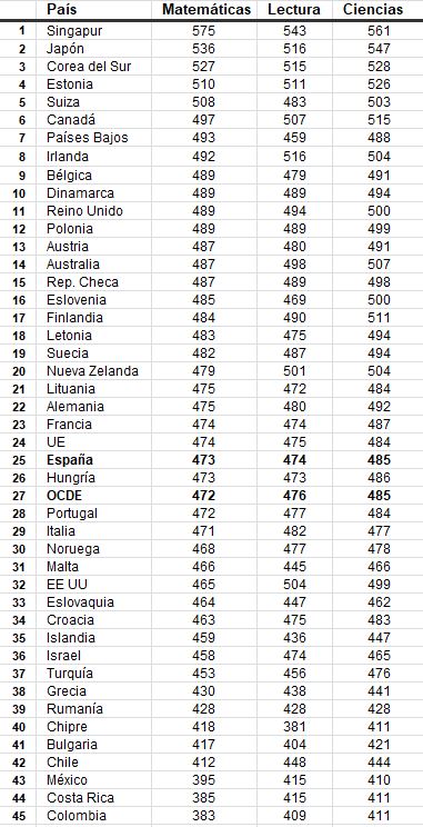 En definitiva, los resultados obtenidos por nuestro país deben ser considerados como bastante decepcionantes, teniendo en cuenta que son los más bajos desde 2000 en matemáticas y en ciencias, con una importante caída de 12,4 y 12,1 puntos respectivamente; y el segundo peor registro de la serie histórica en lectura, bajando 16,5 puntos.